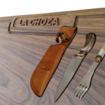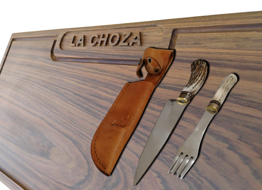 Kit de una tabla de asado en madera dura personalizada de 50cm x 28cm + set de cuchillo y tenedor artesanales.
