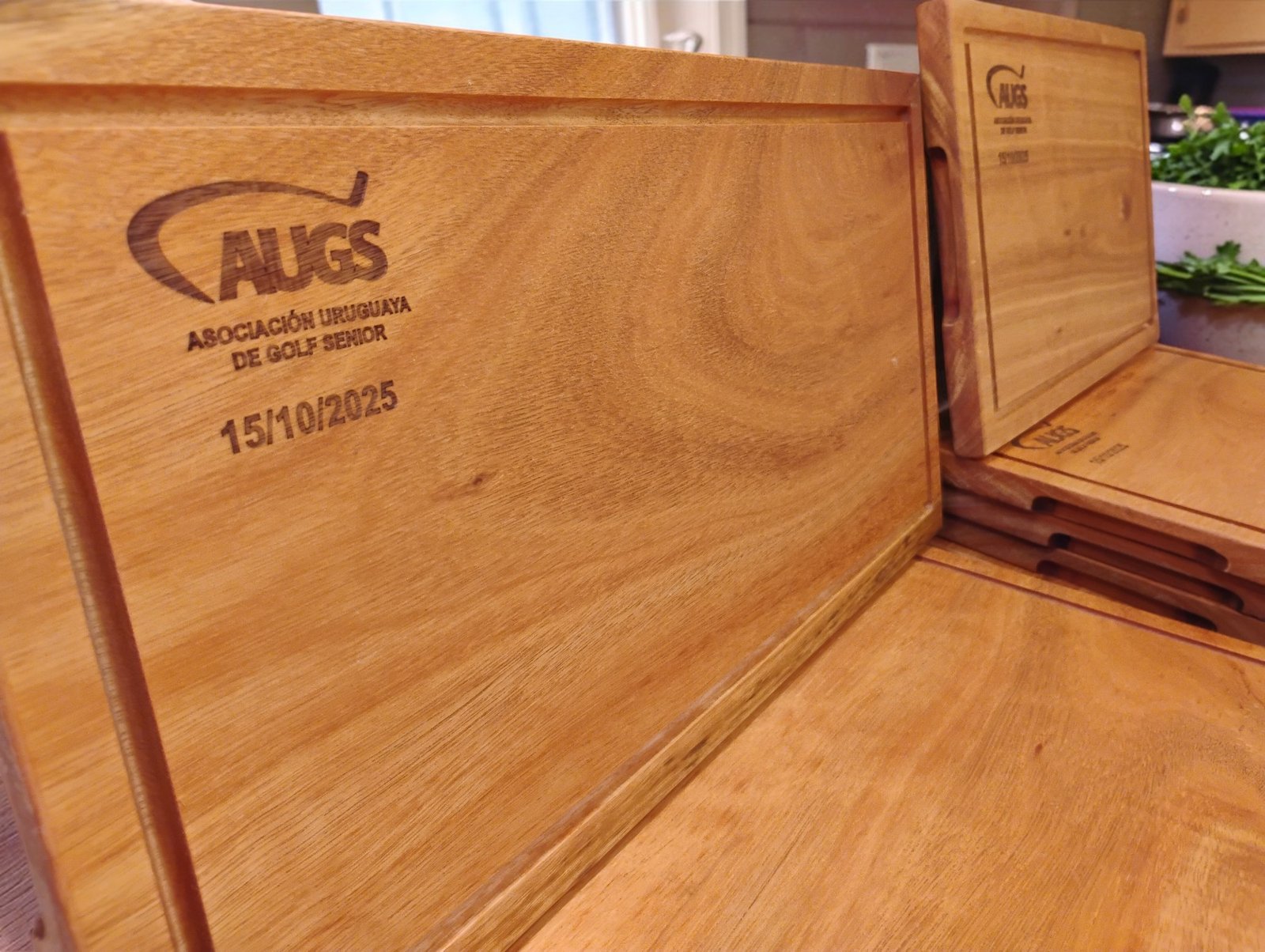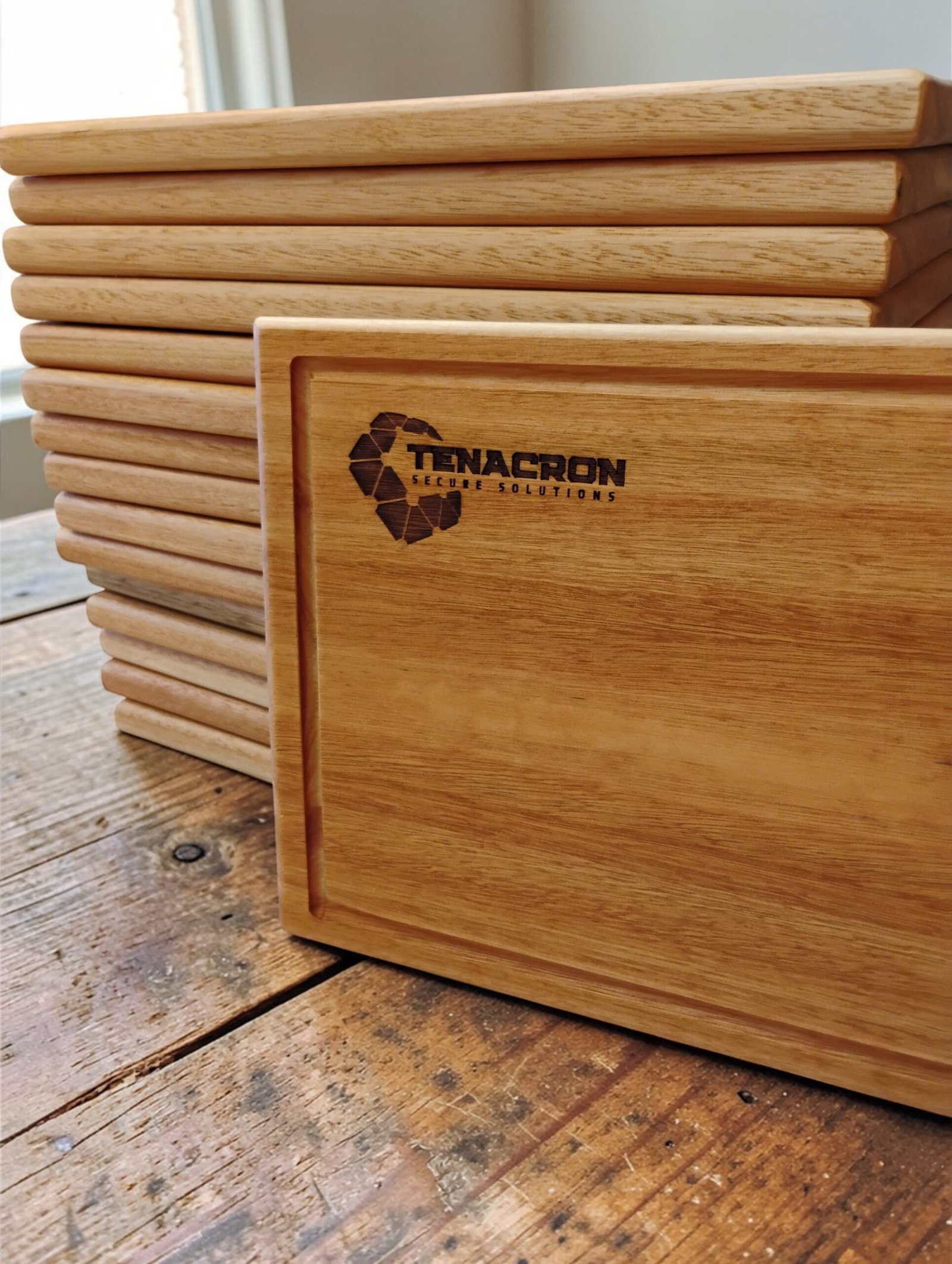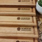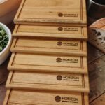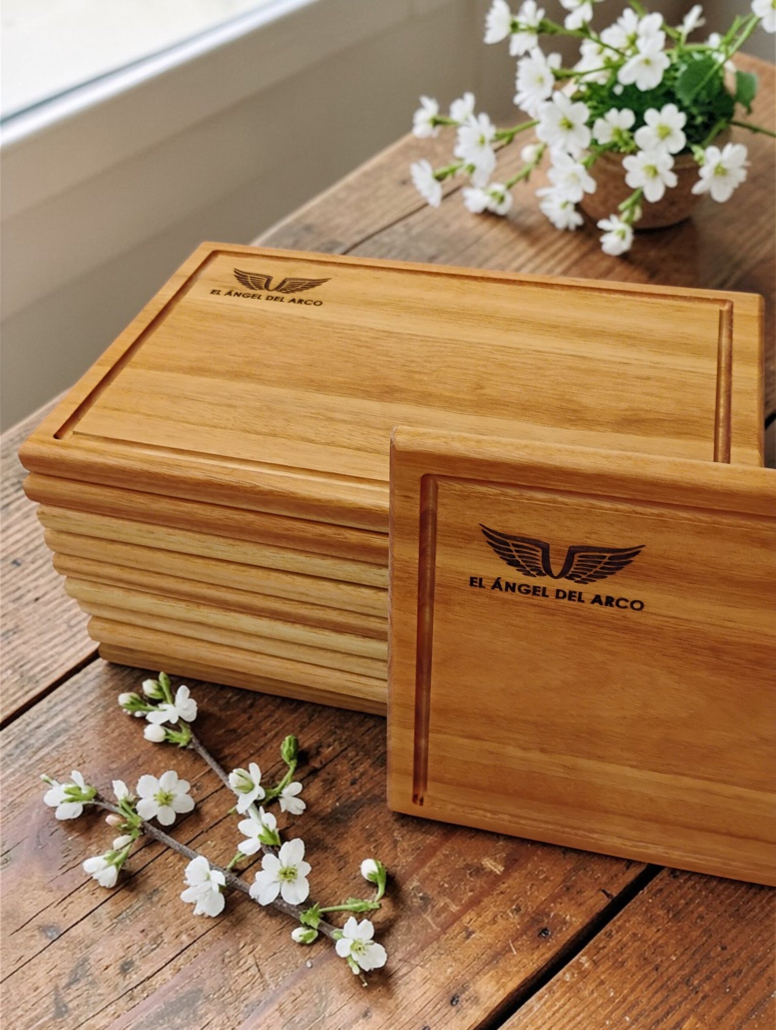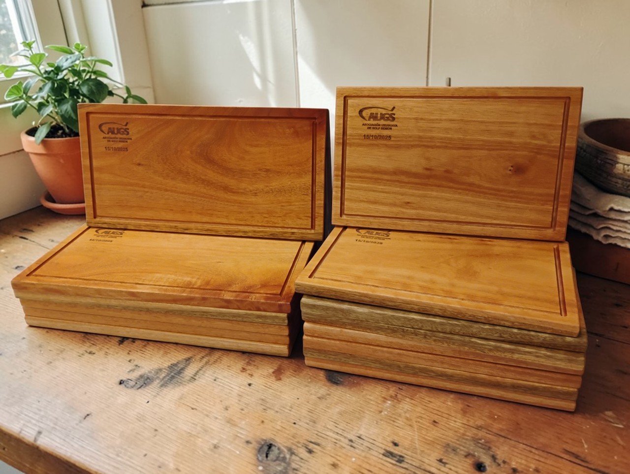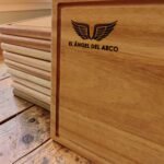 20 Tablas Artesanales en madera con logo grabado.